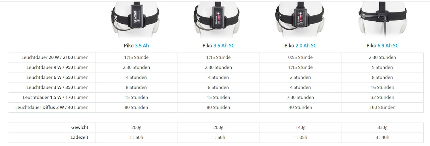 - im Lieferumfang dieser Version ist der 6.9 Ah SmartCore Akku enthalten. Damit hat die Lampe je nach Leuchtmodus 2h30 bis 160 h Leuchtausdauer. Der akku kann einfach gewechselt werden, wer weniger lange Touren macht kann leichtere Austausch-Akkus mit 3.5 Ah wählen, wer den Komfort des SmartCore Akkus nicht braucht kann auf die einfacheren und günstigeren Akkus von lupine wechseln. Sehen Sie bei uns oder bei lupine nach den Möglichkeiten, oder fragen Sie uns um Rat